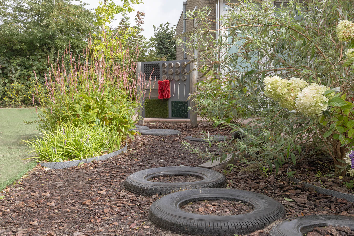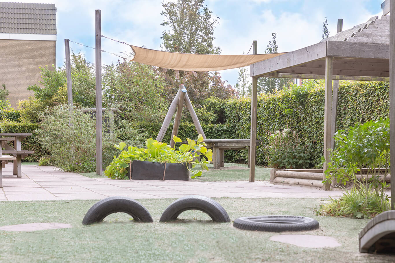 Our babies have a separate garden – the toddler garden is quite a bit larger and features a blackboard, a water table, a sandbox, bicycles, and a living willow tunnel. For our older toddlers, we also provide a sand and water table with a water pump.