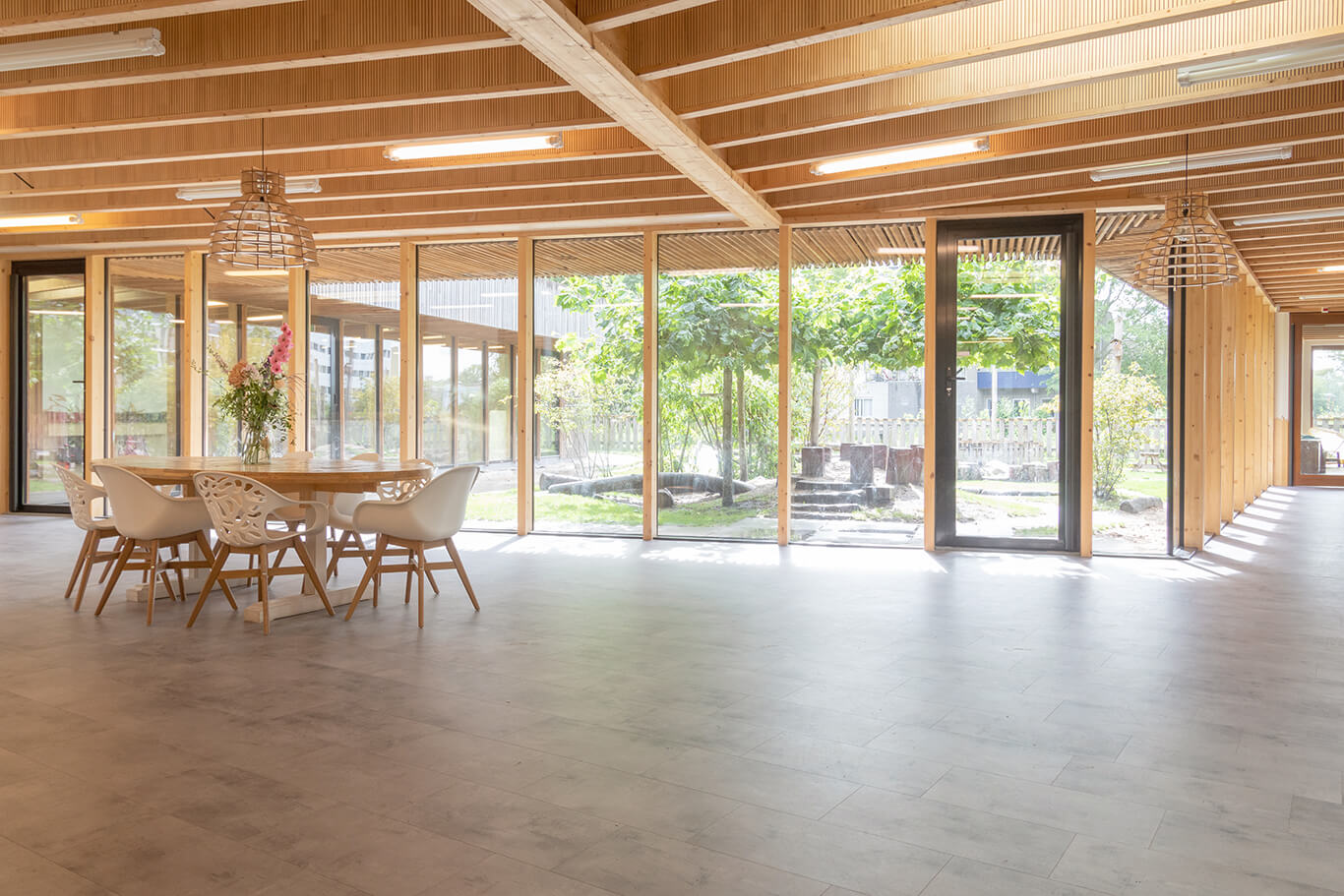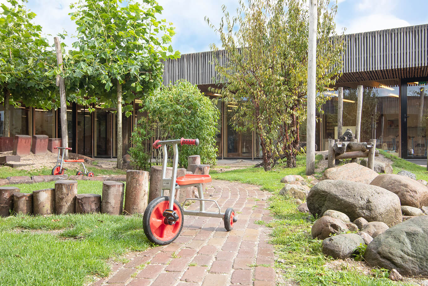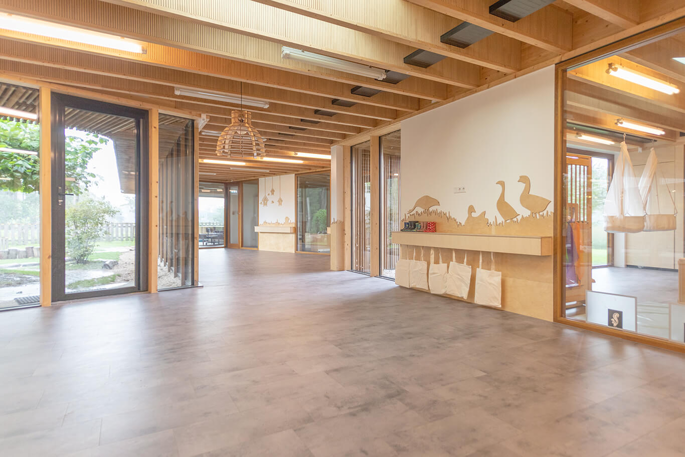 Our unique and sustainable building was designed as a clover-shaped daycare center. The floor-to-ceiling windows let in lots of natural light in the general play areas located around the central garden. Since we’re a single-storey building, you can see what’s going on everywhere as soon as you walk in the door. Each of our baby groups has two bedrooms that provide all the rest, relaxation, and safety your child needs. We dress the infants in crawl suits whenever we go outside, and we typically divide the toddlers into smaller groups, so we can focus more of our attention on a particular activity.