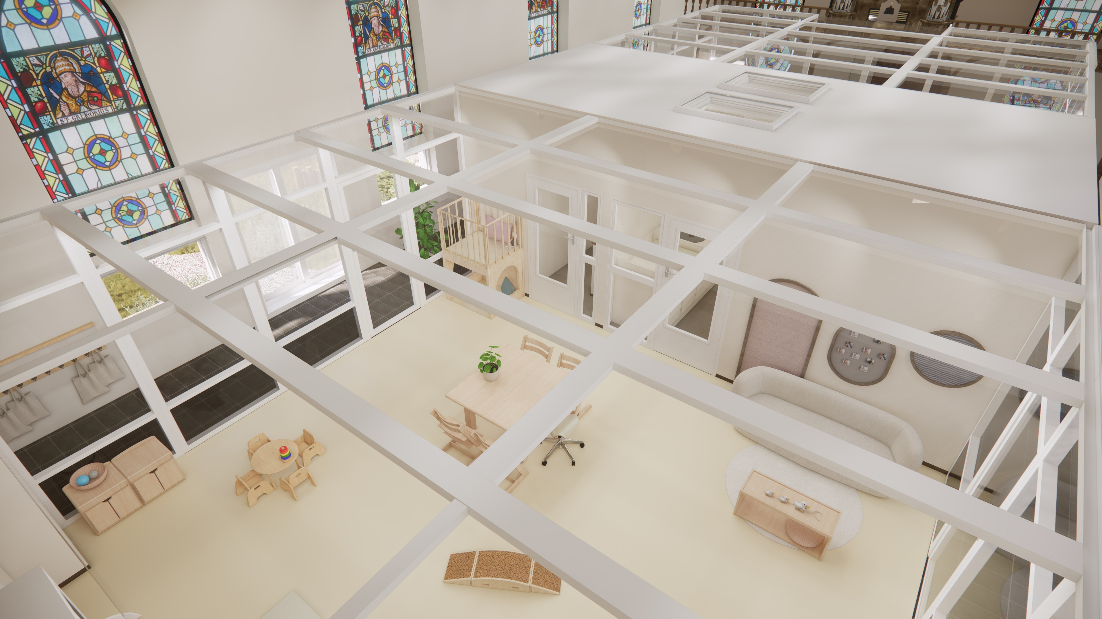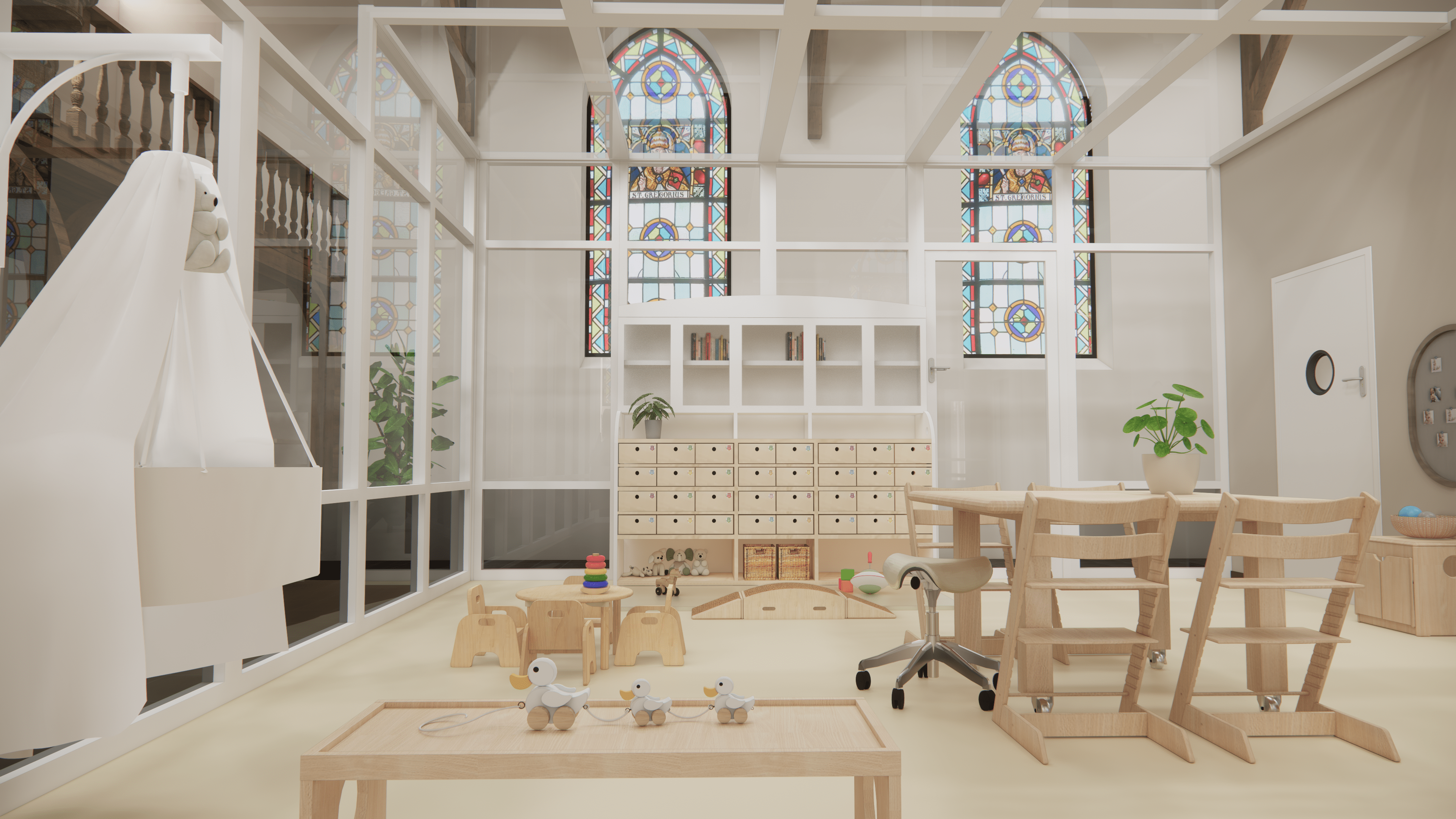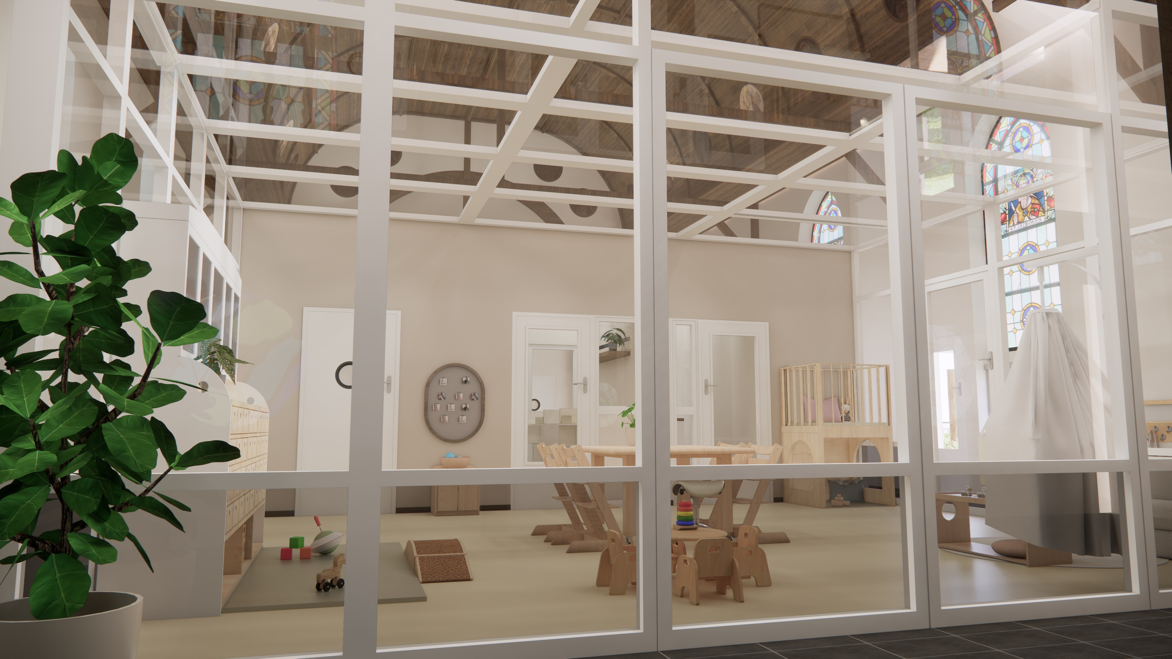 Mid 2026, we proudly open our new location in Doetinchem, situated in the beautiful Sint-Martinuskerk and the associated parish. This is our first location in Doetinchem. This historic church has been completely renovated and designed with childcare in mind, while preserving the church's atmosphere. Our new location offers space for baby groups, toddler groups, and preschool groups, which are spread across the church and the parish. In the church itself, two glass rooms will be placed, fully tailored to the needs and requirements for childcare. We are transforming the church into a pleasant and comfortable place for your child.