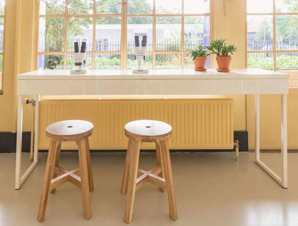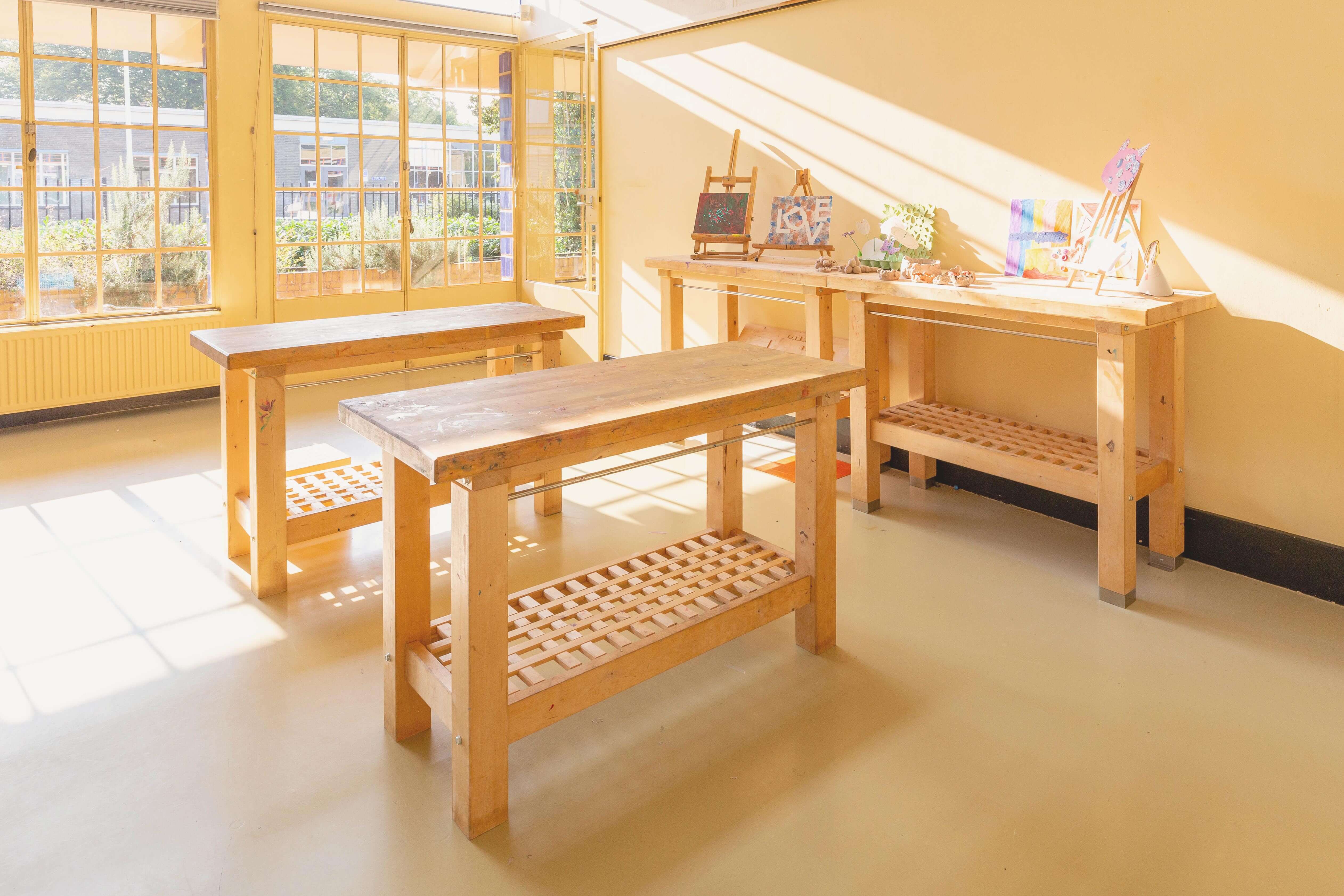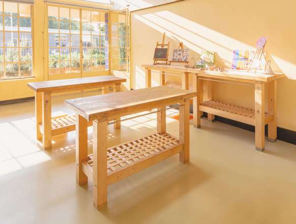 Our after-school care has its own building, located right next to our daycare center. Children love our space for its many large rooms: they can relax here after a busy day at school, or they can participate in any number of activities. Indoors or outdoors, athletic or creative – they get to choose it all themselves. We feel it’s important that they feel at home with us.Our members of staff have creative and/or athletic backgrounds, and challenge the children during a game of table tennis or invite them to do crafts. We have our own yard for outdoor activities and also have access to the large playground of the school next door, which has monkey bars and a soccer pitch. We offer a range of sports and games, including soccer, dodgeball, tag, and field hockey. With good weather, we take the art studio outdoors.