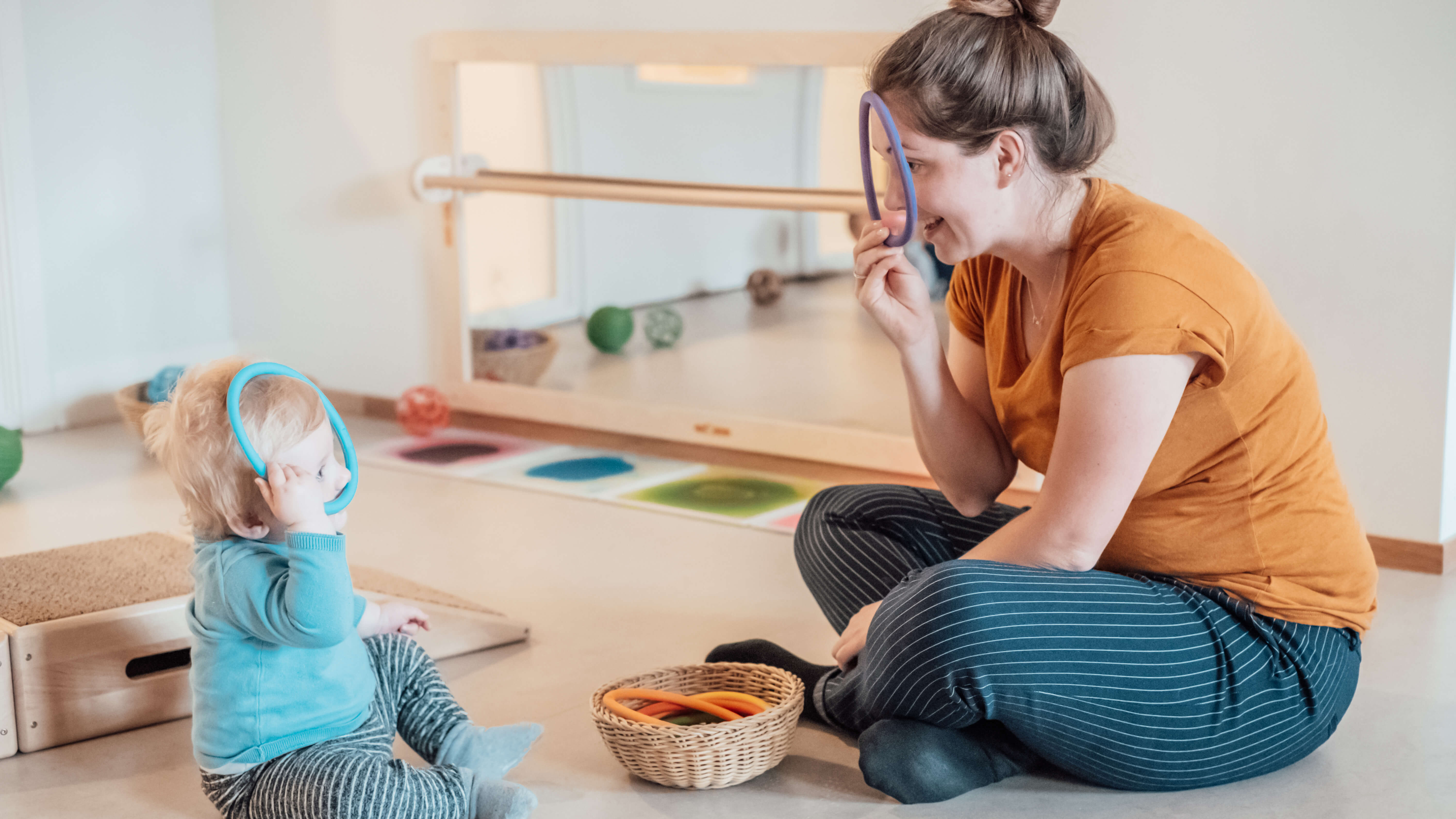 Onze pedagogisch medewerksters creëren situaties die bijdragen aan het gevoel van verwondering bij de kinderen. We gebruiken verschillende kleuren, te beginnen bij rood. Dit is namelijk de eerste kleur die kinderen kunnen zien. Ook dagen we ieder kindje uit door bijvoorbeeld materiaal te gebruiken dat een bepaald geluid maakt, of dat anders aanvoelt, zoals aluminium en hout.
