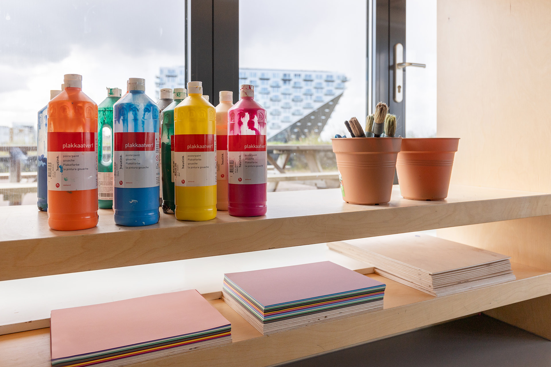 Creatief atelierHier kunnen de kinderen echt hun fantasie en creativiteit de vrije hand geven. We dagen ze uit door allerlei verschillende materialen aan te bieden (hout, steen, klei, verf en bijvoorbeeld ecoline). Dus zeker niet alleen knutselen en tekenen maar ook ontwerpen, vormgeven, bouwen en handarbeid.