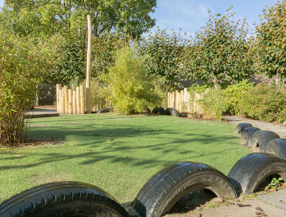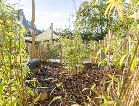 Buiten vind je een prachtige beschutte tuin met een apart deel voor de baby's, schaduwrijk door een zonnescherm en voorzien van een eigen zandbak. Achter in de tuin ontdek je een parcours met houtsnippers, bosjes en looppad. Ook is onze tuin in 2024 opgeknapt met mooie, natuurlijke speelmaterialen. De kinderen kunnen door de hele tuin op ontdekkingstocht!