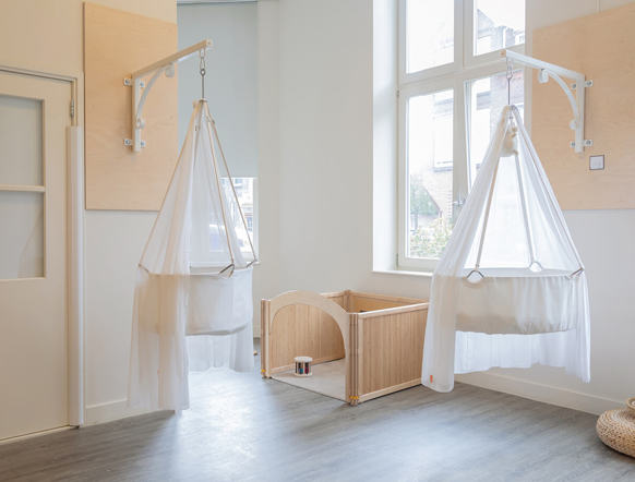 Je zal verrast zijn door de entree van ons kinderdagverblijf. Het trappenhuis van het voormalige schoolgebouw heeft kroonluchters en glas-in-lood, hoge plafonds en veel lichtinval. Dat alles zorgt voor een prettige, lichte sfeer in de hal en de ruime groepen. Op de babygroepen maken we gebruik van hangwiegjes, zodat de jongste baby’s kunnen wennen aan de geluiden en geuren op de groep. Een veilige ruimte op de groep om even tot rust te komen, en zo leren we ook jouw kindje kennen!