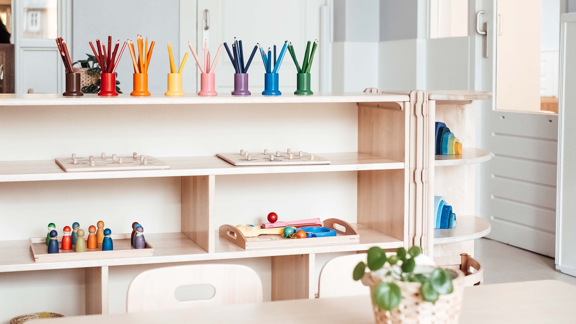 Alles aan onze inrichting nodigt uit om op onderzoek uit te gaan en draagt zo bij aan de ontwikkeling van de kinderen. Daarom hebben we bijna alle meubilair op kind hoogte, zodat de kinderen zelfstandig spelmateriaal kunnen pakken. Vanaf de dreumesgroep krijgen de kinderen yogales en op de peutergroep bieden wij een interactief bewegingsprogramma waarin ze leren; springen, vangen, balanceren en rennen.