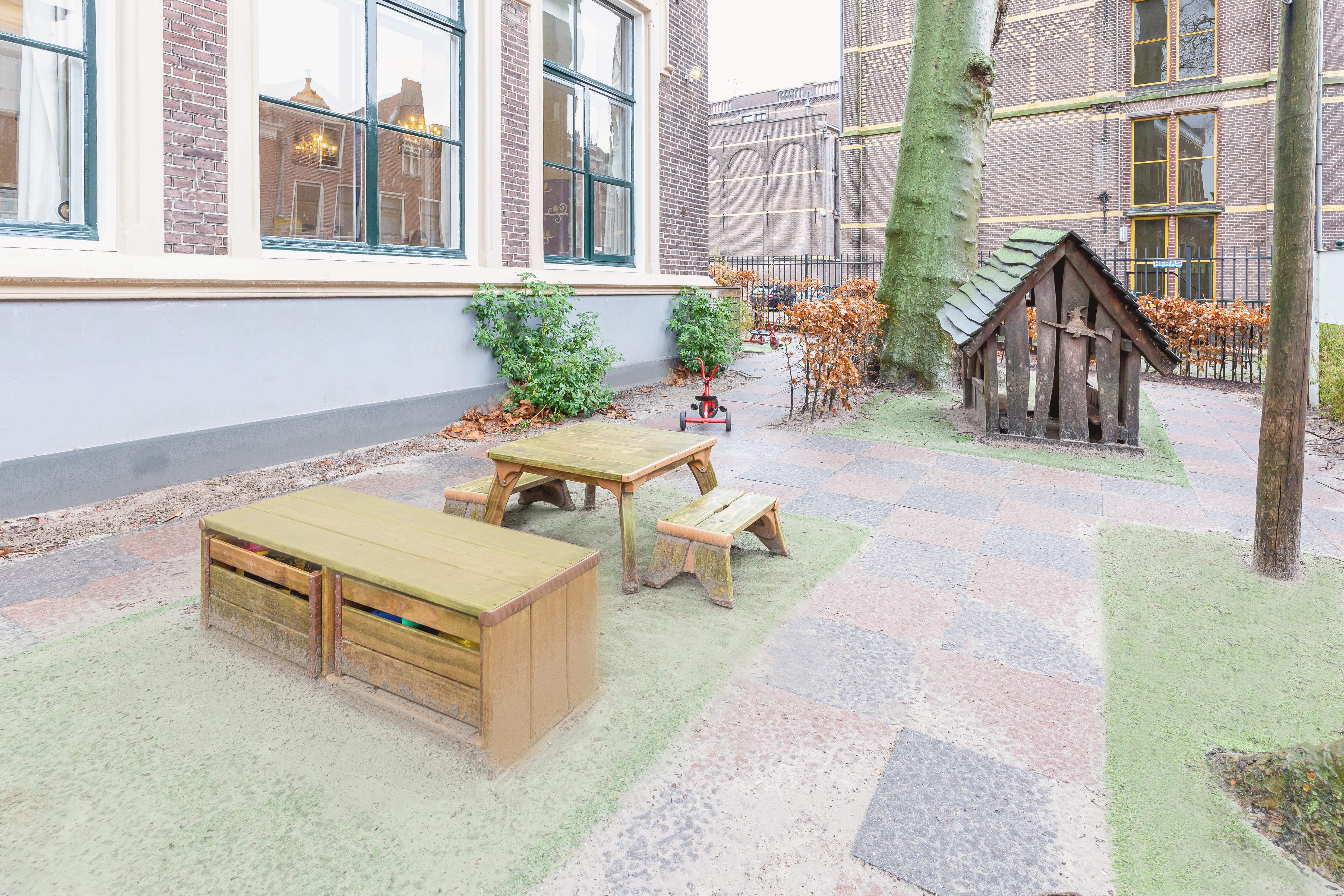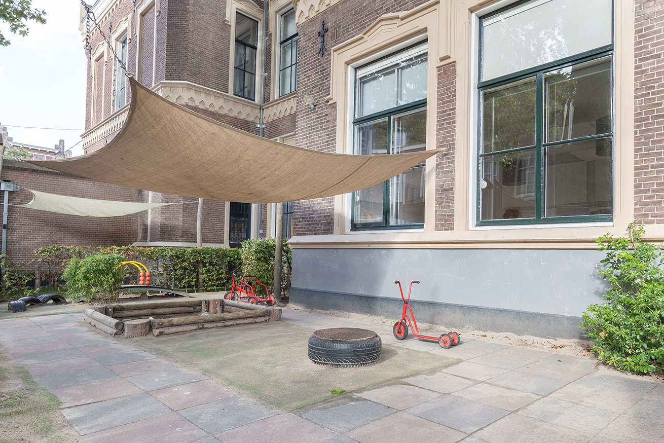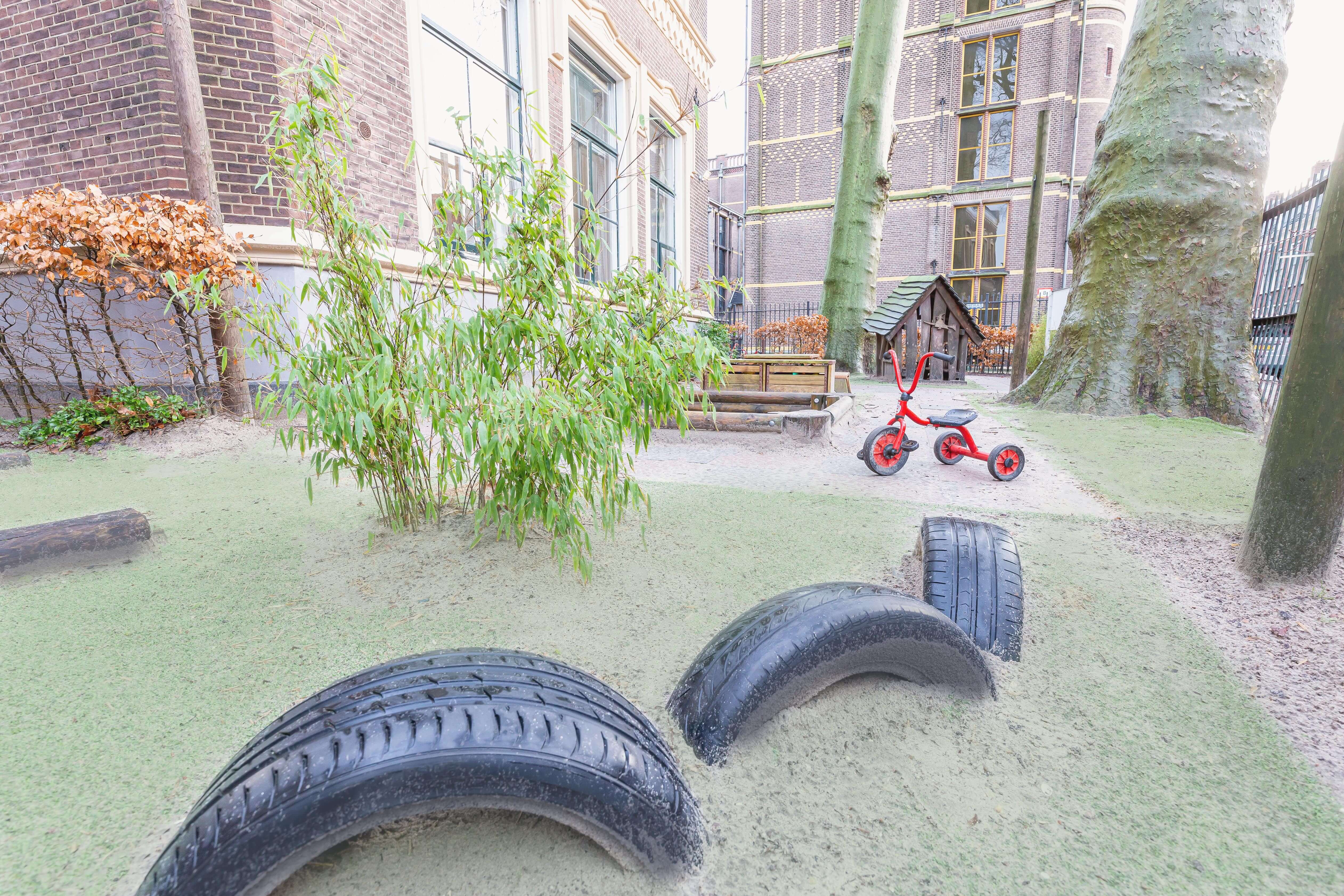 Buiten moedigen we de kinderen aan om lekker veel te bewegen. We hebben de tuin helemaal afgestemd op hun belevingswereld. Een heuvel waar je op kan klimmen en vanaf kan rollen, een bamboebos en een waterloop: een beekje waar je het water ziet (en kan voelen!) stromen. Je kunt bootjes laten varen en dammen bouwen.