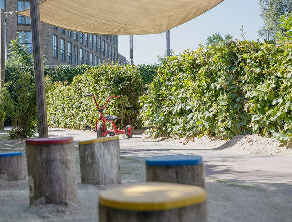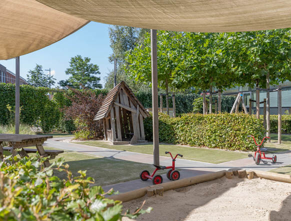 We hebben twee tuinen. Een grote met leuke hoekjes, een huisje en een klimtoestel. Prettig en praktisch: alles wat je binnen hebt kun je makkelijk mee naar buiten nemen, omdat het pand gelijkvloers is. In de aparte babytuin genieten de allerkleinsten van de buitenlucht, met een heuveltje, zandbakje en bruggetje. Samen met de peuters verzorgen we onze moestuin.