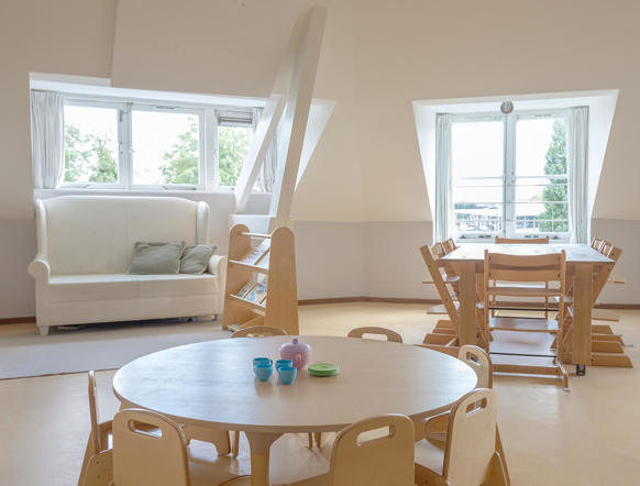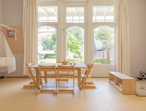 Alle ruimtes hebben een warme, huiselijke uitstraling. We zorgen voor knusse, duidelijk herkenbare hoeken waar je baby heen kan kruipen om spelmaterialen te ontdekken. Die herkenbaarheid voelt veilig. Ook zorgen we voor beperking van de prikkels in deze hoeken. Daardoor wordt je kindje minder afgeleid en blijft het beter in zijn of haar spel.