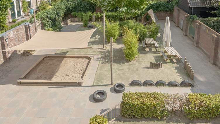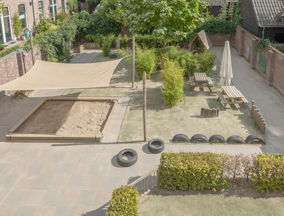 Ga onze flinke, diepe tuin in en je vergeet dat je in de stad bent! Er zijn zigzag-boompjes waar de dreumesen en peuters zich achter kunnen verstoppen, een grote zandbak en voor de baby’s hebben we een apart deel afgeschermd. Zo kunnen ook zij vrij ontdekken en spelen in de buitenlucht. Natuurlijk plaatsen we schaduwdoeken in de zomer.