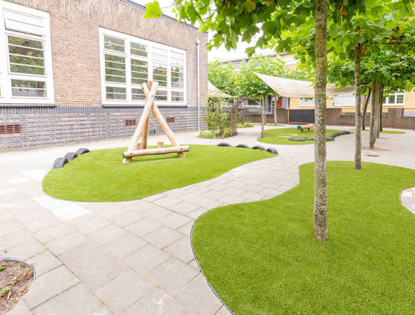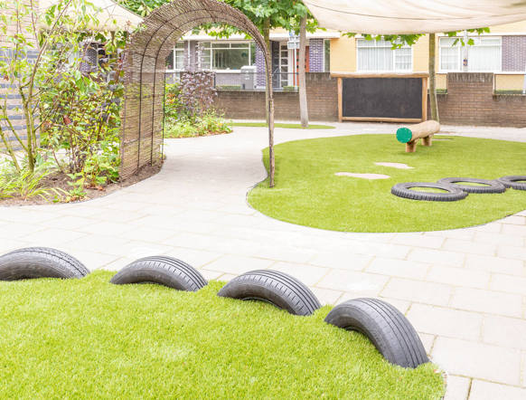 Kinderen ervaren buiten meer vrijheid en zelfstandigheid. Daar hebben we onze tuin dan ook helemaal op afgestemd. De allerkleinsten genieten van de buitenlucht in hun afgeschermde gedeelte. De kinderen kunnen zich in de tuin verstoppen, gezellig samenkomen of juist even alleen zijn. Niet iedereen wil altijd alleen maar rennen, toch? Onze uitdagende buitentuin biedt klim- en klautermogelijkheden, fietsjes en een grote zandbak. Dreumesen en peuters spelen samen buiten, wat de doorstroom versoepelt omdat alle kindjes en medewerkers elkaar goed kennen.